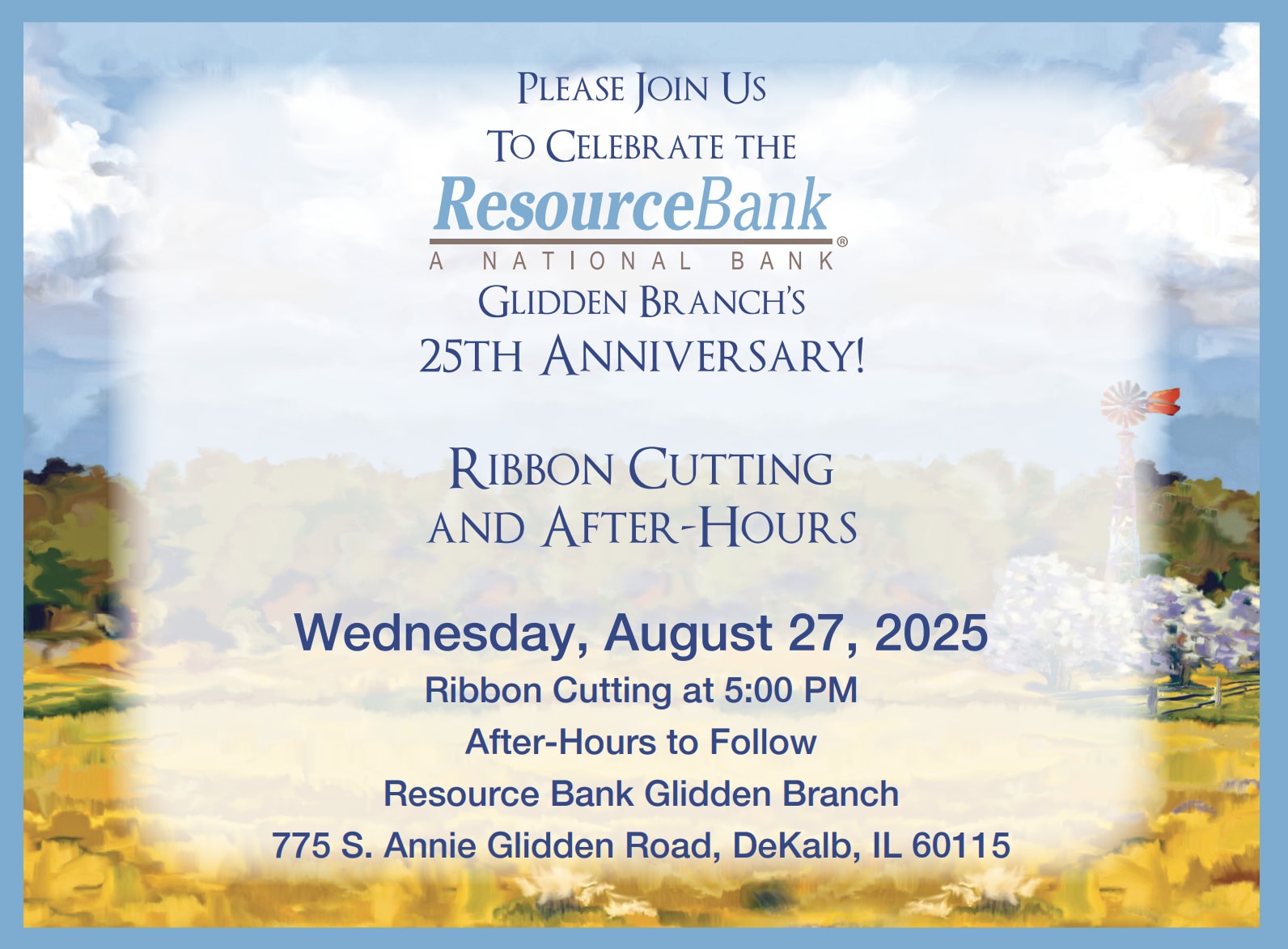 Join us for a ribbon cutting to celebrate 25 years of the Resource Bank Glidden Branch! We will be celebrating with a ribbon cutting at 5pm** before their Business After Hours on Wednesday, August 27th at their branch at 775 S. Annie Glidden Rd. DeKalb IL 60115. Plan to stick around for light refreshments and casual networking with fellow Chamber Members 5-6:30pm.